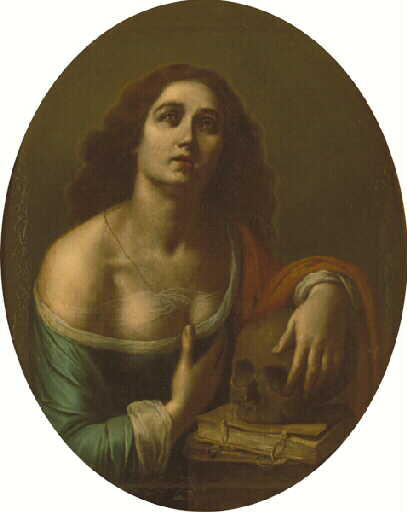 Madeleine en buste, épaule droite dénudée, main gauche posée sur un crâne et une bible; robe bleue, écharpe rouge