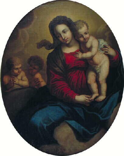 Donné à Louis Carrache dans l'inventaire Ronot. ; Elle est jeune, fine, jolie avec une physionomie assez italienne. Pensive, elle tient tendrement contre elle, avec un grand naturel, son petit garçon et se détache sur un ciel de nuages accompagnée par deux petits putti en conversation animée ; un léger vent semble animer cette petite scène. La forme ovale de la peinture en enfermant doucement les personnages ajoute à la tendresse des attitudes. Vêtue, comme le veut la tradition, de rouge et de bleu profonds, cette Vierge à l'enfant est identifiée dans la collection Ronot comme un travail de l'atelier des Carrache. Une pointe de maniérisme, ainsi que le canon des traits du visage de Marie, évoquent aussi le souvenir du Corrège. NT