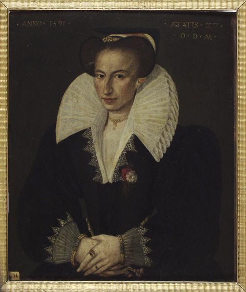Ce portrait s'orne d'un cadre identique au précédent, comme pour réaliser un pendant dans la collection Ronot ; A l'inventaire, il est mentionné selon les indications de la donation : portrait de la duchesse de Montpensier par Clouet. Les attributions ont des fortunes diverses : celle de l'artiste paraît chronologiquement difficile - François Clouet, fils de Jean, meurt en 1572 -, en revanche celle du personnage n'est pas impossible ; il pourrait donc s'agir - le tableau portant la mention 'ANNO 1591', de Catherine Marie de Lorraine, fille de François de Guise, épouse de Louis II de Bourbon, duc de Montpensier, née en 1552, morte en 1596 ; avec ses frères, Henri de Guise et le duc de Mayenne, elle prit une part active aux guerres de la Ligue, en opposition au gouvernement de Henri III. Ces deux peintures appartiennent à la période qui, avec la renaissance et la montée du courant humaniste en Europe (Flandre, Italie, France, Allemagne), donne son essor au portrait. Le XVIème siècle voit la multiplication des 'galeries', l'intérêt de plus en plus profane pour la représentation ressemblante du visage et la codification du genre
