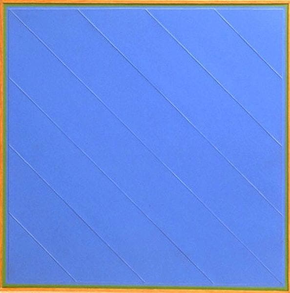 HONEGGER : Zurich, 1917 ; Zurich, 2016 ; Issu du milieu des graphistes zurichois, Gottfried Honegger a choisi la voie exclusive de la peinture en 1958, à New York, après avoir rencontré les peintres B. Newman, M. Rothko ou S. Francis. La dimension métaphysique de leur oeuvre a constitué un apport que son appartenance au groupe de l'Art Concret Zurichois ne lui faisait pas juger primordiale jusqu'alors. Le manifeste de 1930 affirmait : ' l'art concret veut transformer le monde, rendre l'existence plus supportable et exprime le désir d'un monde meilleur ' (J. Arp). Les arts appliqués, l'engagement moral et politique avec des artistes-théoriciens tels Van Doesburg, Albers ou les zurichois Bill, Lohse, Graeser, Honegger le retrouve aujourd'hui à l'Espace des Arts Concret de Mouans-Sartoux qu'il anime tant par des expositions que par la pédagogie. Dans les années 70, Honegger s'exprime aussi bien par la peinture que par la sculpture au moyen d'assemblages mathématiques de formes géométriques simples (parfois aléatoires, parfois déterminées par ordinateur). En parallèle à la réalisation de la sculpture monumentale du collège de Blanzy en Saône-et-Loire, hommage au livre fondamental de Jacques Monod Le hasard et la nécessité, une exposition dijonnaise montrait, en 1980, une série de ' tableaux-reliefs ' dont la peinture mâconnaise est issue après un passage dans une collection privée. De petit format, elle est pourtant significative de l'art d'Honegger de cette période. La technique assez sophistiquée dévoile un travail patient qui, par son ascèse, conduit à la modulation quasi infinie de la lumière. L'audace, ici, se situe dans l'usage peu orthodoxe d'un liseré vert d'une valeur équivalente au bleu qui n'est pas immédiatement perceptible et qui, au lieu de clore le tableau sur lui-même, le situe dans l'espace réel de son accrochage, c'est à dire, selon l'artiste, dans la dimension humaine.