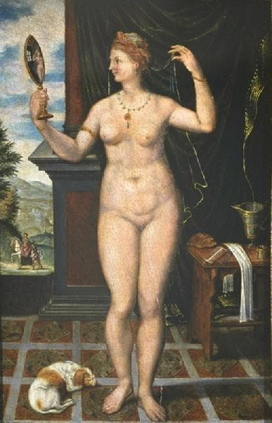 A l'époque de la Renaissance française, Vénus fut souvent invoquée, tant par les poètes que par les peintres, lorsqu'il s'agissait de donner une allégorie de l'amour et de sublimer le corps féminin. Cette Vénus d'un artiste Bellifontin est reconnaissable à ses attributs, le peigne, le miroir et la perle qui rappelle sa naissance marine. Le sujet de cette oeuvre maniériste et la façon dont il est traité témoignent du goût d'une cour raffinée pour un art érotique qui trahit ici une double influence italienne et nordique. La sensibilité du peintre à la beauté et la forme antique s'exprime dans la représentation d'une nudité parfaite, au hiératisme de statue, à la chair toute marmoréenne. La draperie et le motif architectural qui délimitent l'espace, le riche dallage en marbre coloré, sont traités dans un esprit fortement italianisant, tandis que le miroir convexe et la nature morte d'objets de toilette soigneusement rangés, sont respectivement d'inspiration flamande et hollandaise. Le 'Blanc poli ivoire' du corps de la déesse, paré d'un seul voile de gaz translucide, rehaussé de bijoux et surpris au moment de la toilette, le chien endormi et le miroir d'apparat sont autant d'éléments qui confèrent une connotation sensuelle au sujet principal auquel fait écho, à l'arrière-plan, une scène de courtoisie. Le recours à la mythologie ne sert qu'à rendre plus sensible le sentiment naturel. Mais la beauté n'est-elle pas aussi fragile et éphémère que l'ardeur de la passion amoureuse ?