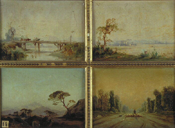 Une certaine unité a été recherchée par l'artiste familier des paysages aux ciels clairs, aux arbres qui s'y découpent élégamment, comme s'il avait voulu établir deux lignes d'horizon en rassemblant les petites peintures deux par deux; calmes et plates pour la partie supérieure, plus contrastée et mouvementée pour la partie basse, ce qui renforce également une idée de premier plan comme dans n'importe quelle composition paysagère classique. Bufs traversant un pont de la gauche vers la droite; berger avec ses moutons, isolé comme un point de fuite entre la perspective des peupliers; démonstration d'une culture picturale du paysage - celle du Lorrain - avec les arbres au tronc ployé par un vent dominant ou bien vieilli, déformé par les ans, inscrivant leurs arabesques sur des ciels clairs. Tout ce savoir peindre, exprimé dans des petits formats, n'a pourtant pas permis à Eugène Deshayes d'obtenir une réelle postérité. (Marie Lapalus)