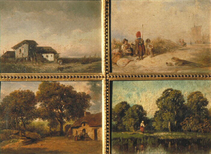Sur la diagonale, les paysans au repos et la chaumière près des arbres, sont réalisés sur des petits panneaux de chêne propices à la peinture de plein air comme la ferme isolée dont le support - toile très fine ou papier - est également marouflé sur chêne. Seul le dernier panneau est sur carton; la matière picturale est d'ailleurs plus épaisse. La présence de l'eau, avec ses reflets, la densité des grands arbres, ont sans doute conduit la légataire (Melle Duché, 1897) à donner ces petits paysages au plus célèbre des peintres paysagistes de Barbizon, Théodore Rousseau. Il n'est pas exclu que la fermière au bord de l'étang reste en quête d'auteur. (Marie Lapalus)