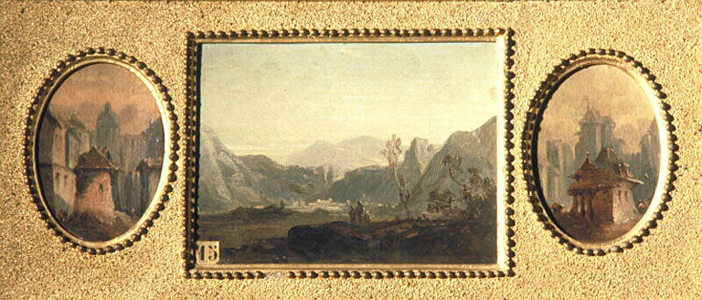 La réduction dans un 'format de poche' sur le panneau central d'un paysage classique, telles les compositions achevées de Valenciennes (1750 - 1819) ou de Michallon (1796 - 1882), n'aurait pas suffi à nous montrer l'originalité d'Eugène Deshayes. En revanche les deux peintures inscrites dans l'ovale affirment ses capacités à inventer l'étrangeté. Ces paysages oniriques nous renvoient, avec celui conservé au Louvre, dans un univers fait d'architectures curieusement difformes, allongées à l'excès et s'inscrivant dans une nature qui a les mêmes propriétés. Les teintes sourdes et nettement plus chaudes que dans les autres ' études ' mâconnaises, confèrent à l'ensemble, composé en triptyque, un charme certain et nous transposent dans un passé iconographique et pictural beaucoup plus lointain que celui de ces peintures réalisées au milieu du 19e siècle. (Marie Lapalus)