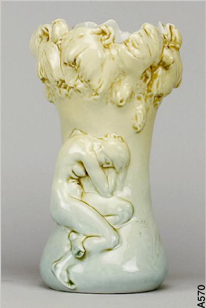 Porcelaine dure nouvelle, décor de grand feu couverte colorée ; Une femme nue en relief se détache sur un fond vert et jaune pâle. Fleur de pavot.