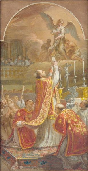 Il s'agit du moment de l'Elévation. Saint Jean de Matha, devant l'autel, entouré de deux diacres, présente l'hostie aux fidèles ; sur l'autel, un crucifix entouré de chandeliers et le calice avec la pale ; un servant, droite, encense l'assemblée ; A l'arrière, une assemblée ; deux fidèles portent des flambeaux ; au-dessus de l'autel, un ange apparaît entourés de deux captifs. Saint Jean de Matha (1160-1213) est ordonné prêtre en 1193. Au cours de sa première messe, une vision le détermine à fonder l'Ordre de la Très Sainte Trinité et de la Rédemption des Captifs. Cet Ordre aura pour mission de racheter les captifs, victimes des razzias en Méditerranée. Ce n'est qu'au 17e siècle que Jean de Matha sera canonisé et son culte, rendu public. Ce petit tableau pourrait être le témoin du développement d'une iconographie qui rappelle la place de l'Eucharistie dans la vie du saint et des religieux de son Ordre.