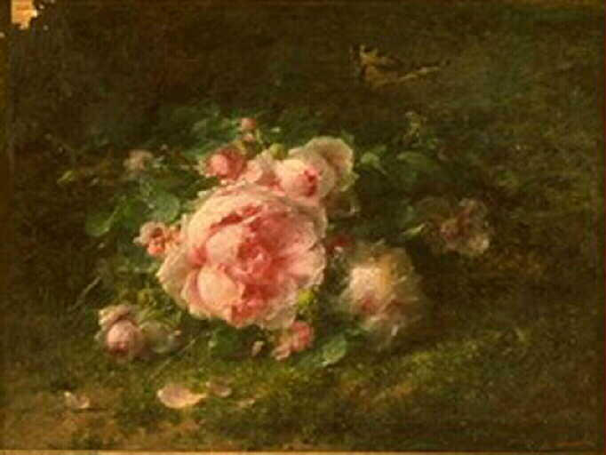 Un bouquet de roses, mouillées de la rosée matinale, est posé sur un lit de mousse, une d'elles, trop épanouie s'effeuille, un papillon, attiré par leur parfum, vient s'y reposer.