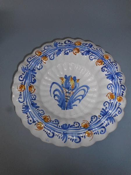 Assiette en faïence émaillé ; Assiette creuse, ronde et godronnée. Rinceaux décoratifs sur tout le pourtour de l'assiette. Fleur jaune et bleu dans le creux de l'assiette sur fond blanc.