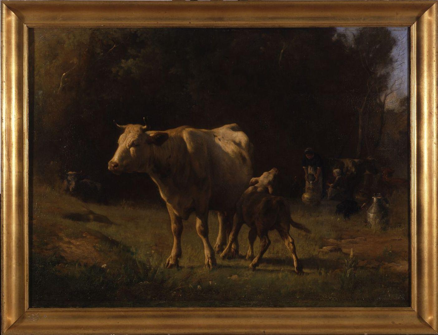 représentation animalière (vache ; traite ; paysanne ; arbre ; champ ; veau ; lait ; femme ; fillette ; pot)