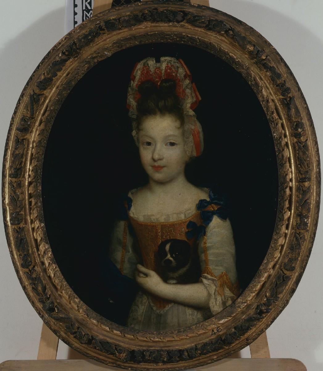 portrait (jeune fille ; robe : noeud ; chapeau ; chien)