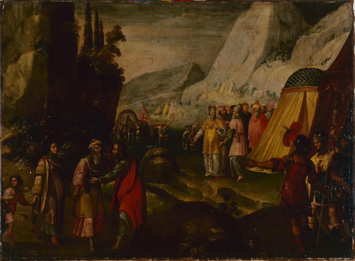 scène biblique (vallée ; montagne ; Jourdain ; homme ; femme ; soldat ; épée ; tente ; casque)