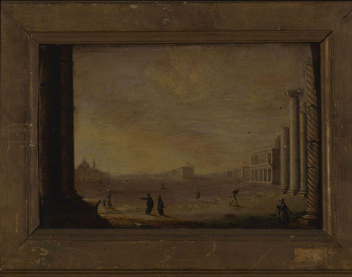 scène (architecture ; colonne ; bâtiment ; personnage ; homme ; toge ; femme ; enfant ; arcade)