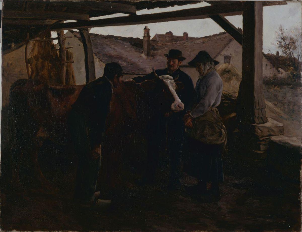 scène (vache : maladie ; homme ; paysan ; étable à vaches)
