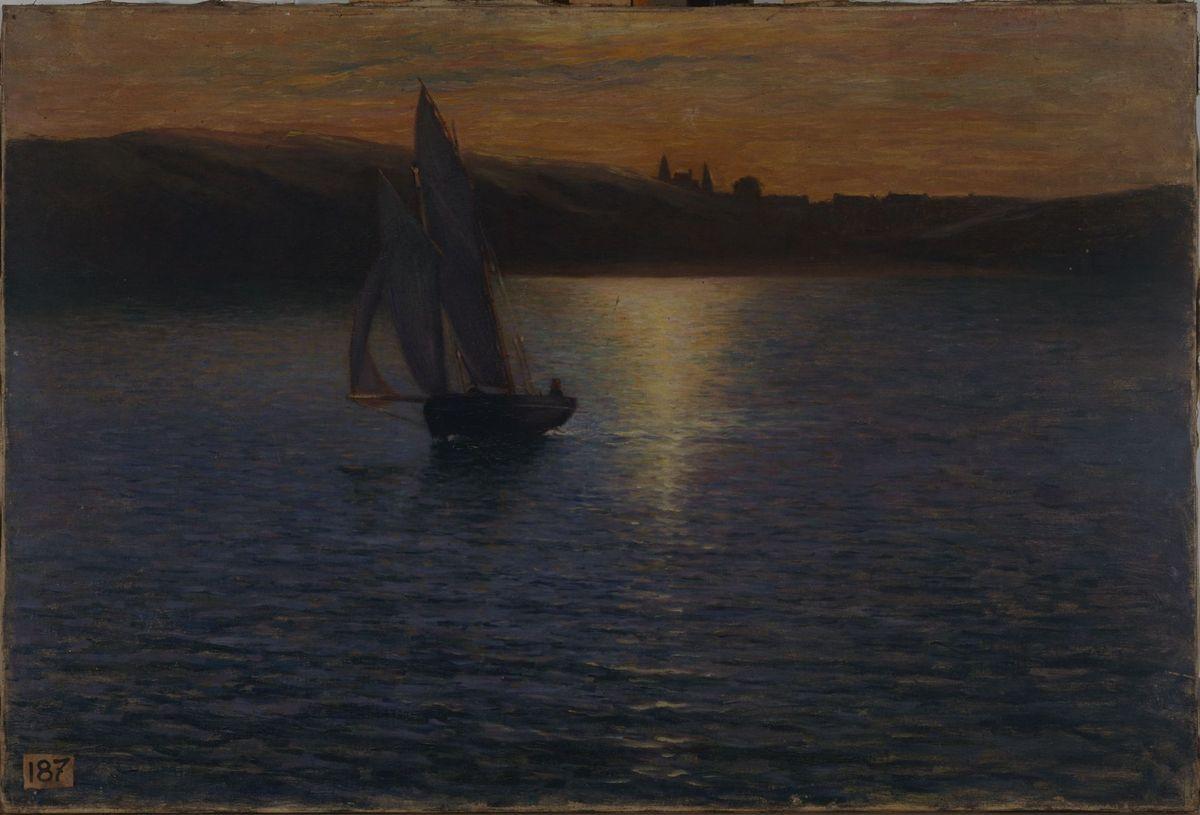 paysage (mer ; bord de mer ; bateau à voiles ; crépuscule)