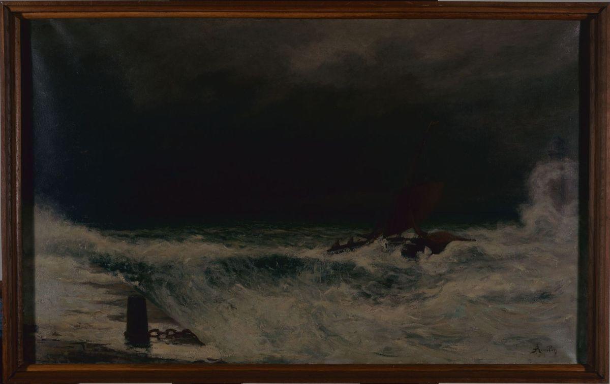 paysage (mer ; tempête ; vague ; digue ; rocher ; bateau à voiles)