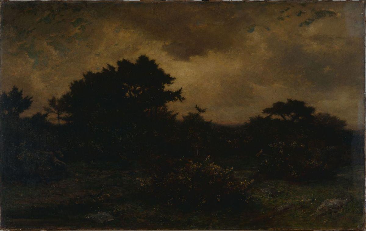 paysage (champ ; arbre ; végétation ; pin ; bruyère ; ciel ; nuage ; effet de soleil ; chien ; lapin ; lièvre ; chasse)