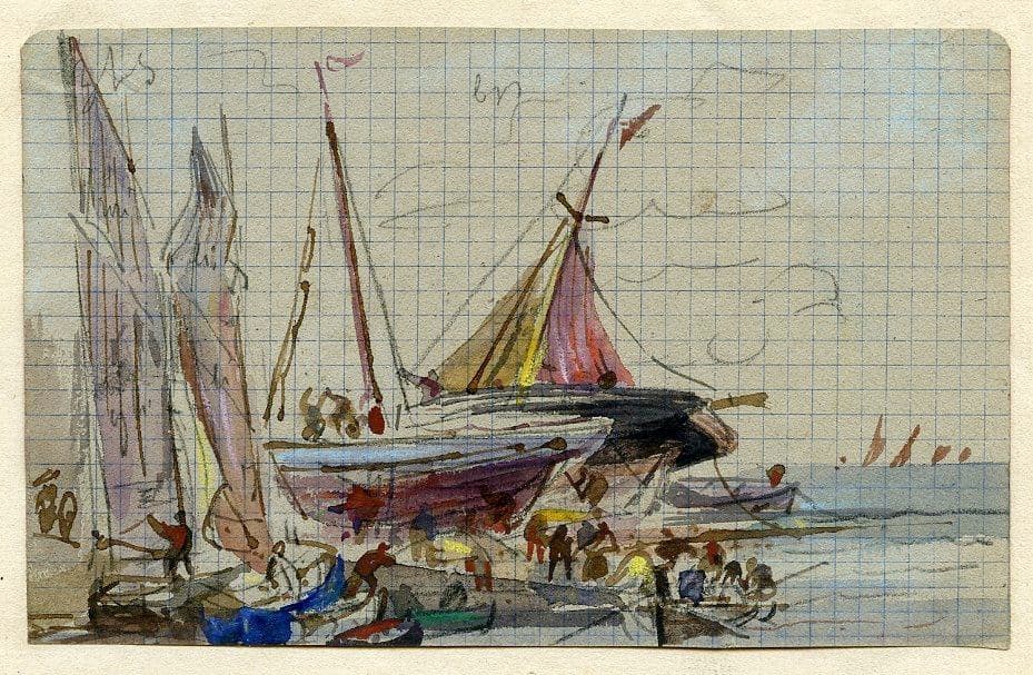 Cotres échoués et personnages débarquant