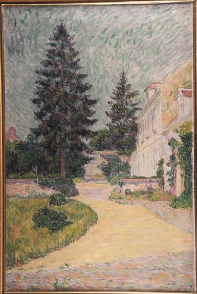 Paysage, sans personnage, représentant une grande maison avec un jardin entouré de grands arbres.