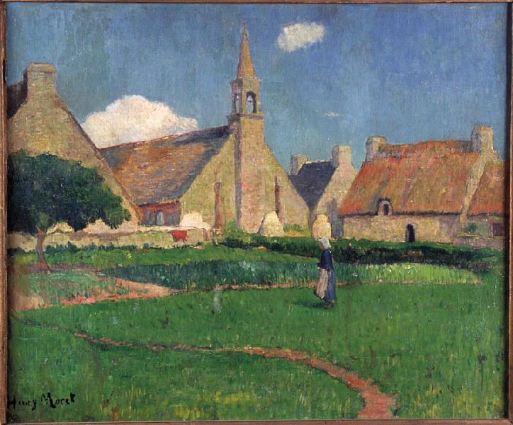 paysage ; figure (Le Pouldu, village, chapelle, maison, arbre, femme, Bretonne)