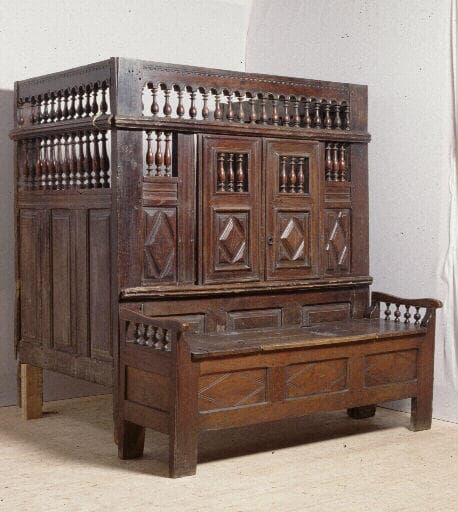 Trois parties lorsque le meuble est monté. Dossier 94 = lit-clos. Dossier 355 = banc. ; C'est du logement communautaire, mêlant, dans une salle commune, parents, grands-parents, enfants, valets et servantes, que le lit-clos (gwele kloz) tire sans doute son origine : il procurait une intimité tout en protégeant du froid. Il domina en Basse-Bretagne, à partir du XVIIIe siècle, mais les logis les plus misérables ne connaissaient encore, au début du siècle suivant, que la très modeste 'couchette de clisses'de vannerie. Chez les paysans aisés, le lit-clos était souvent réservé au maître de maison, les autres membres de la maisonnée se contentant de châlits, coffre ouverts pourvus d'un ballot de paille. Les plus anciens lits-clos du Finistère sont des lits 'carosses', à trois ou quatre côtés ouverts, ou des lits d'angle, -présents en Léon au XVIIe siècle. Leur succédèrent les lits à encastrer, ouverts et ornés seulement en façade, incorporés dans l'alignement des meubles de la salle commune. Un lit échappait à cette disposition, placé face à la table et accolé d'un coffre qui servait de banc. Le décor du lit contribuait souvent à la protection religieuse du foyer, à travers son décor sculpté, sur lequel le monogramme du Christ est fréquent (I. H. S. Iesus Hominum Salvator), par l'intermédiaire d'un bénitier de faïence accroché à la façade, ou au moyen d'une figurine de Vierge, placée dans une niche au centre de la corniche. Placé contre la façade du lit-clos, le banc tossel faisait à la fois office de siège, de coffre, et de marchepied permettant l'accès à la couchette. On y posait le berceau (ber), à portée de la surveillance des parents, mais hors d'atteinte des rongeurs ou des animaux domestiques