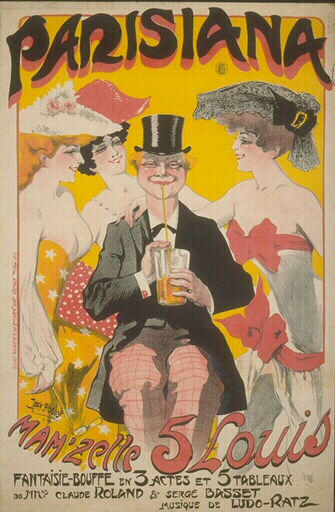 PARISIANA. Mam'zelle 5 louis, fantaisie-bouffe en 3 actes et 5 tableaux, de Mrs Claude Roland & Serge Basset, musique de Ludo-Ratz.Imp. Thil. Atelier Jack Abeillé, 73 rue Blanche, Paris. Signature en bas à gauche: Jack Abeillé 04