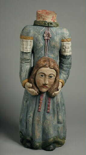 figure (sainte Solange, portant : tête, sang, cheveux, coiffure, robe (fleur) ; chaussure)