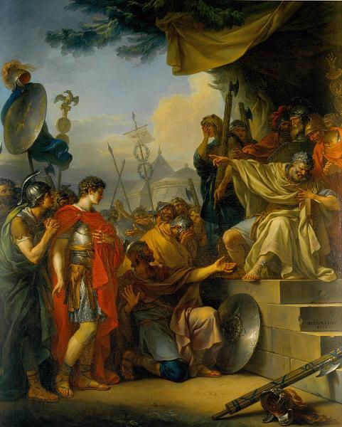 scène historique (Titus Manlius Torquatus, assis, sentence, Antiquité, soldat : Romain, sentence, jugement, peine de mort, prière, plaidoirie, dais, estrade, arme, casque, étendard, bouclier)