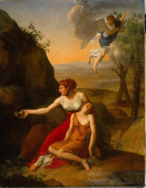 scène biblique ; (groupe de figures, Agar, Ismaël, ange, désert, source, eau, abandon, évanouissement, soin, étreinte, végétation, bois mort, palmier, bol, turban, enfant) ; fond de paysage