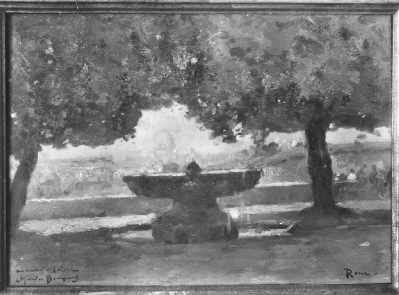 Probablement exécutée lors du premier voyage de Bompard en Italie, cette peinture, traitée à la manière d'une esquisse représente la célèbre vasque de la villa Médicis, à Rome. A l'instar de ses illustres prédécesseurs, Bompart adopte l'angle le plus favorable à la représentation de la fontaine dans son cadre de verdure. Il accentue l'effet de voûte produit par les chênes verts qui bordent l'esplanade du Pincio, attenante à la vasque, créant un vide dans lequel il loge, en les décalant vers la gauche, le dôme de Saint-Pierre et le château Saint-Ange.