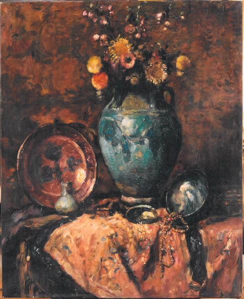 Les empâtements vigoureux du châle et du vase indiquent une oeuvre situable dans la dernière décennie du siècle, tandis que le coloris ambré, par ses chaudes modulations, rappelle les compositions vénitiennes de l'artiste ou certaines de ses scènes algériennes. Par la largeur de la facture et par le traitement de la lumière, par son cadrage serré, sur le fond abstrait , cette oeuvre s'inscrit dans le courant qui affecte l'évolution de la nature morte amorcée dès les années 1870, en réaction à une peinture minutieuse et descriptive.