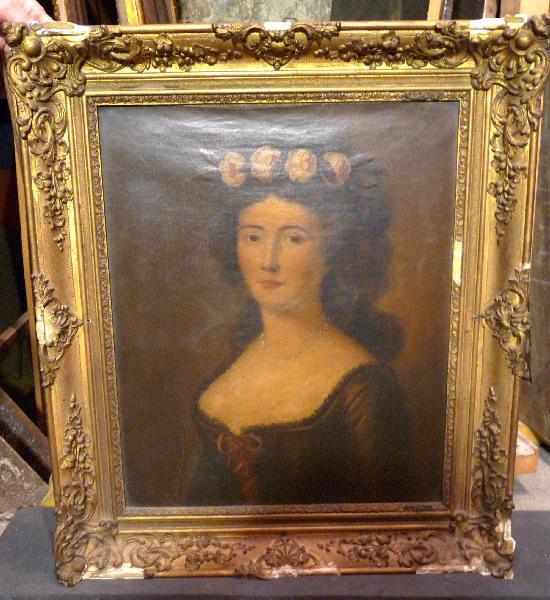 étiquette manuscrite à l'encre au dos de la toile : Claire Jeanne fille de Lodomar Ruel de Launay de Bellisle / Colonel du génie, née à / Lorient le 12 Xbre 1775, épousa Pierre François Julien Papion / propriétaire de la manufacture / royale à Tours... / morte le 27 7bre 1829