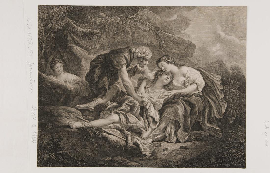 marque concernant les collections : oui ; Filigrane : non ; Autre inscription : Au verso, au crayon : 'Télémaque dans les bras de Calypso par Beauvarlet, 1ere épreuve rare,d'après Raoux//Tiré d'un carton/portefeuille de Boucher// ou Eisen' ; Notes manuscrites sur l'ancien montage : 'Télémaque dans l'Ile de Calypso, d'après Raoux Jean'