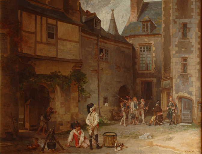 scène (Vendée d, Guerres de Vendée, château, cour, soldat, officier, femme, tambour)