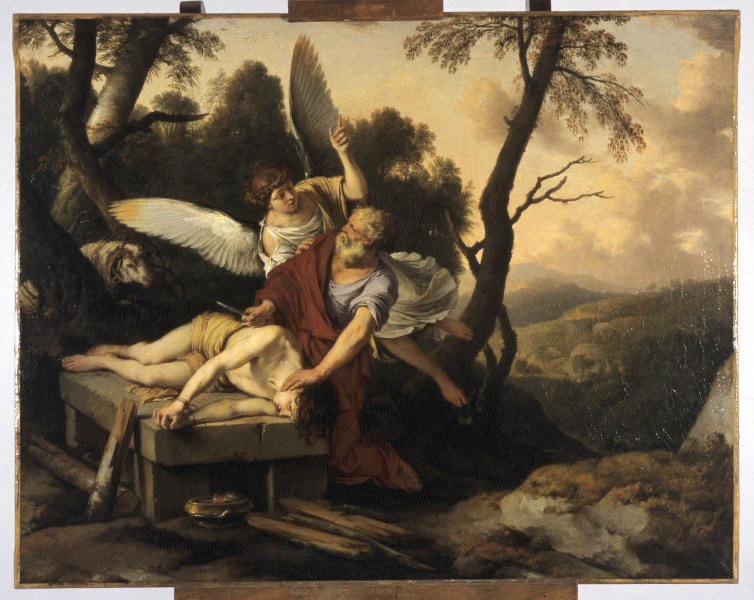 Huile sur toile ; A gauche, Isaac couché sur l'autel ; l'ange arrête Abraham en lui posant la main sur l'épaule ; en arrière-plan, arbres, buisson et bélier.
