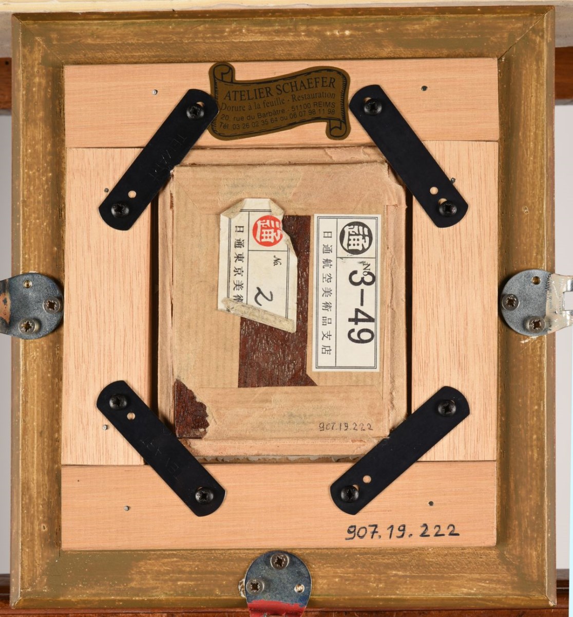 signé, en bas à droite : Renoir ; marque de l'encadreur, étiquette, sur le cadre, au dos : en haut, Atelier SCHAEFER ; marque de transit, étiquette, au dos, au centre : à deux reprises, Japon ; marque de musée, étiquette, au dos : non observé [récol. 2014], Musée / de / Reims ; annotation, numéro, étiquette, sur le cadre, au dos : [récol. 2014], 6082 / Renoir ; Marquage numéro d'inventaire, sur l'objet