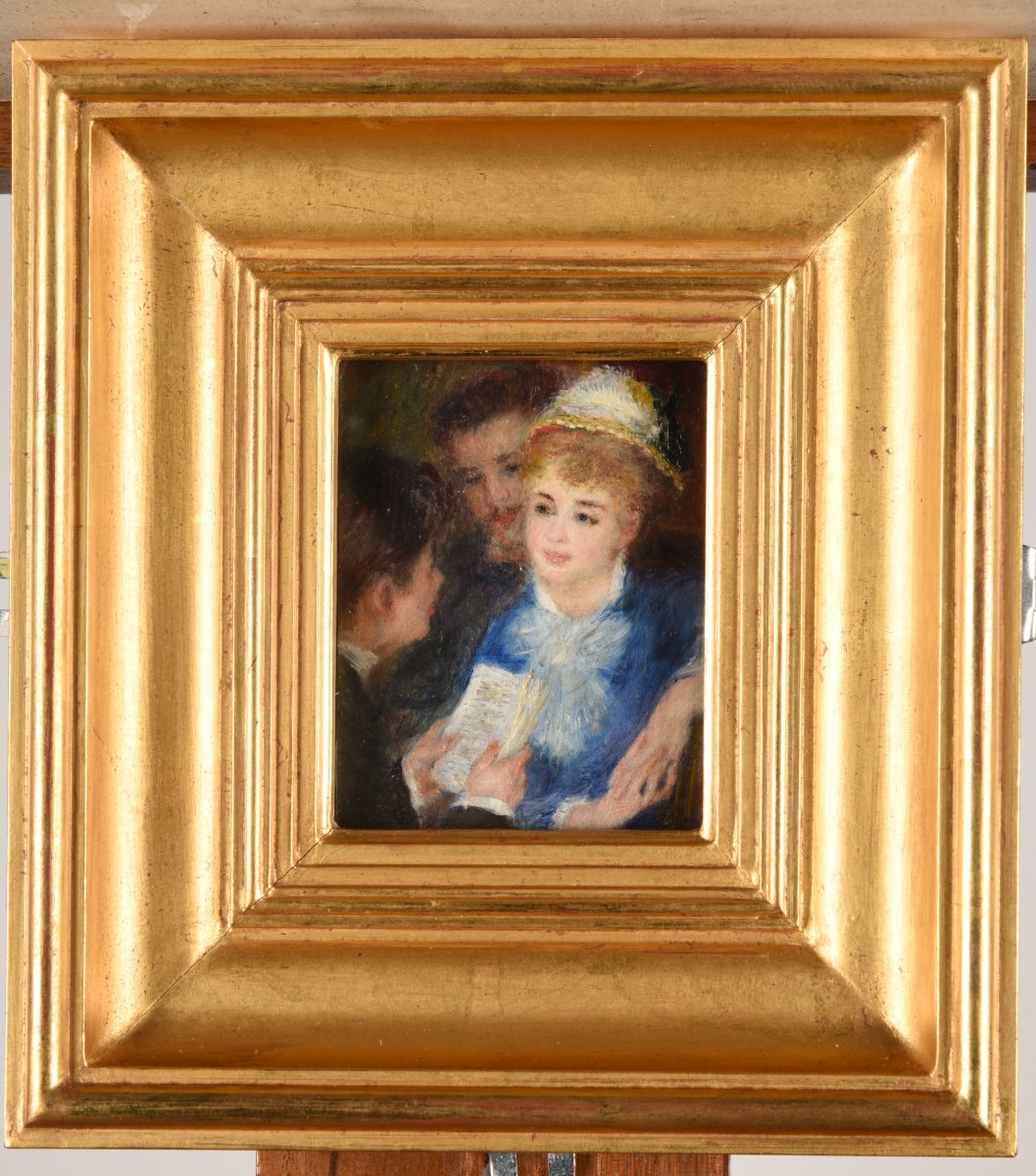 Par ses dimensions, ce tableautin est une miniature, un chef-d'oeuvre par la luminosité fine et délicate, la juxtaposition des bleus et des roses. On a cru identifier la jeune femme comme étant Jeanne Samary que Renoir connut en 1877 et dont il admirait la carnation. La comparaison avec le portrait de celle-ci en 1877 et les études faites par la famille de l'artiste ont écarté cette hypothèse.