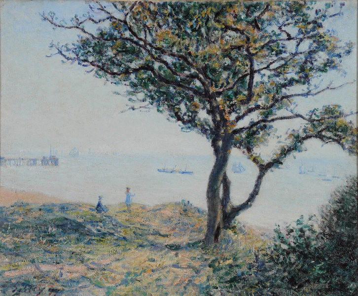 Huile sur toile ; Vue sur la mer depuis une falaise sur laquelle se tiennent deux jeunes femmes ; au premier plan, arbre ; au loin, ponton et voiliers.