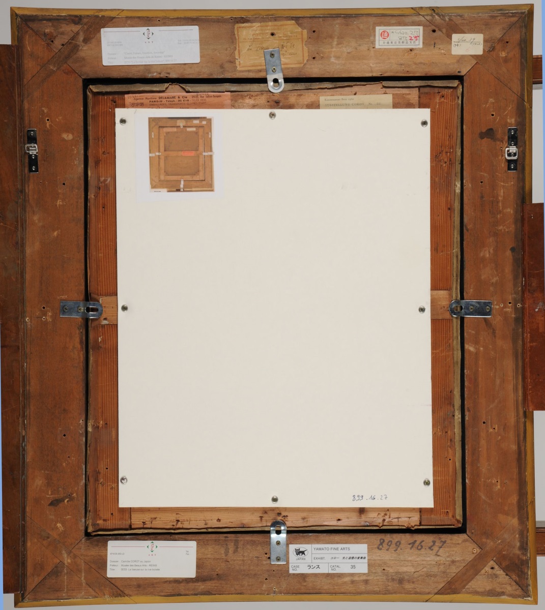signé, en bas à gauche : COROT ; marque de transit, étiquette, sur le cadre, au dos : en haut, LP-ART ; marque de transit, étiquette, sur le cadre, au dos : en haut, POTTIER & CIE ; marque d'exposition, étiquette, sur le cadre, au dos : Japon ; marque d'exposition, étiquette, sur le cadre, au dos : en haut, Japon ; marque de transit, étiquette, sur le cadre, au dos : en bas, Yamato Fine Arts ; marque de transit, étiquette, sur le cadre, au dos : en bas, LP-ART ; marque de transit, étiquette, sur le châssis, en haut : AGENCE MARINTIME DELAMARE & CIE ; marque d'exposition, étiquette, sur le châssis, en haut : Berne 1960 ; annotation, sur le châssis, en haut : au crayon noir, illisible ; marque de transit, étiquette, sur le châssis, traverse horizontale : LEMOINE PÉRIGNON & CIE, masqué [récol. 2014] ; cachet du fournisseur, sur la toile, au revers : en bas, OTTOZ, masqué [récol. 2014] ; Marquage numéro d'inventaire, sur l'objet