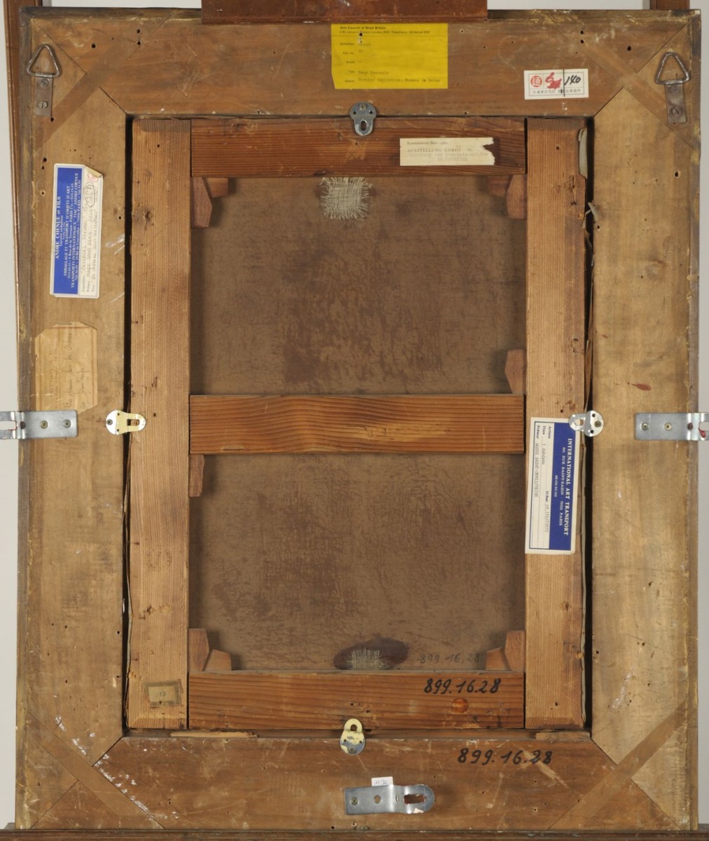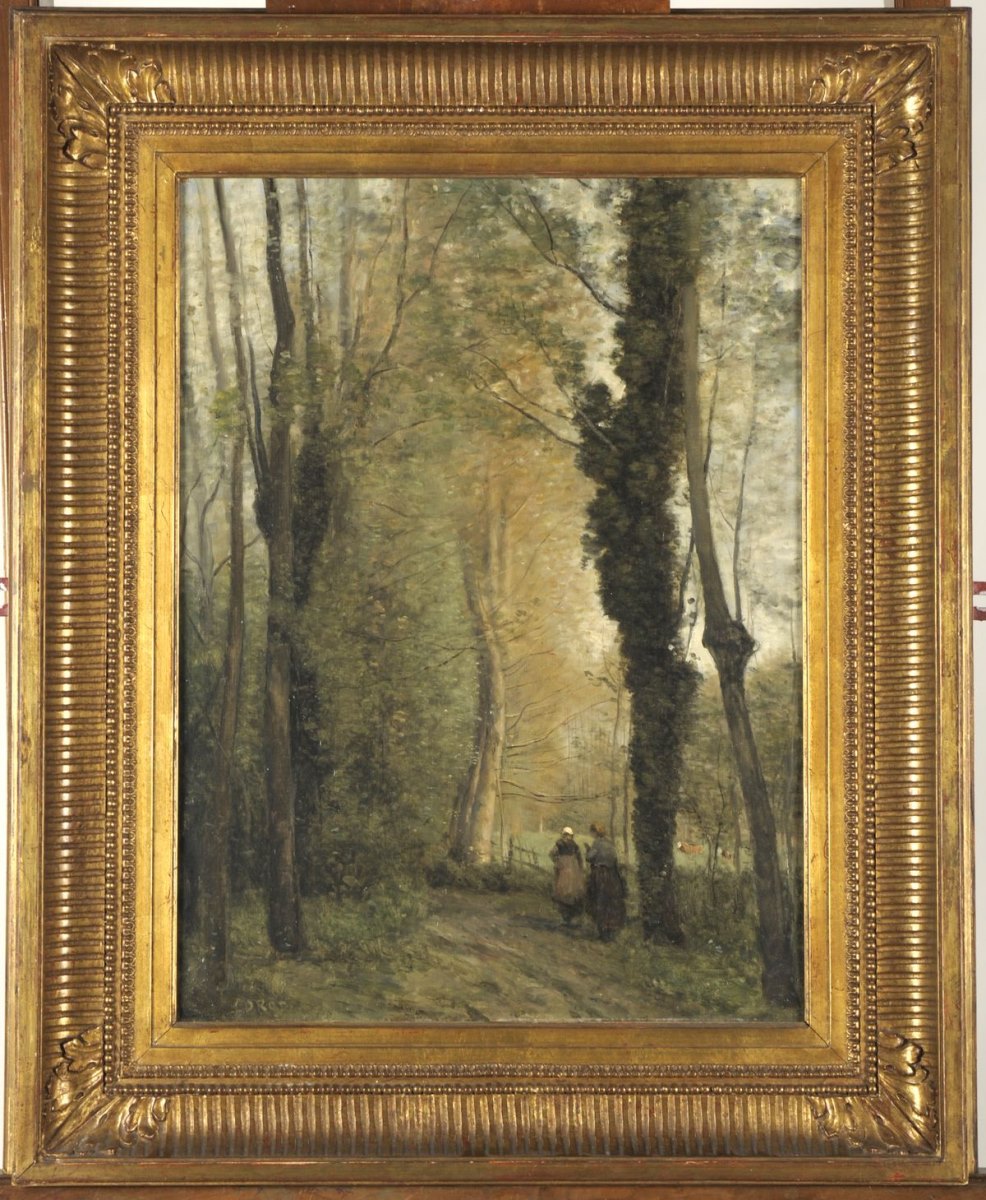 signé, en bas à gauche : COROT ; marque de transit, étiquette, sur le cadre, au dos : en haut à gauche, POTTIER & CIE ; marque de transit, étiquette, sur le cadre, au dos : en haut à gauche, ANDRÉ CHENUE ET FILS ; marque d'exposition, étiquette, sur le cadre, au dos : en haut, Londres ; marque d'exposition, étiquette, sur le cadre, au dos : en haut à droite, Japon ; numéro, sur le cadre, au dos : en haut, à la craie blanche, effacé ; annotation, sur le cadre, au dos : à droite, au crayon à bille noir, effacé, EM 1473/NP/8 ; annotation, étiquette, sur le cadre, au dos : en bas, au crayon à bille, MBA ; marque d'exposition, étiquette, sur le châssis, en haut : Berne 1960 ; marque d'exposition, étiquette, sur le châssis, à droite : IAT ; numéro, étiquette, sur le châssis, en bas : étiquette imprimée, 13 ; cachet de douane, sur le châssis, à gauche : Douanes de Paris, DOUANES / PARIS / EXPOSITION ; numéro, sur le châssis, traverse horizontale : au crayon rouge, effacé, [8...) ; annotation, sur le châssis, traverse horizontale : au crayon noir, effacé, [...]er ; cachet, sur la toile, au revers : en bas à gauche, DOUANES / PARIS / EXPOSITION ; Marquage numéro d'inventaire, sur l'objet