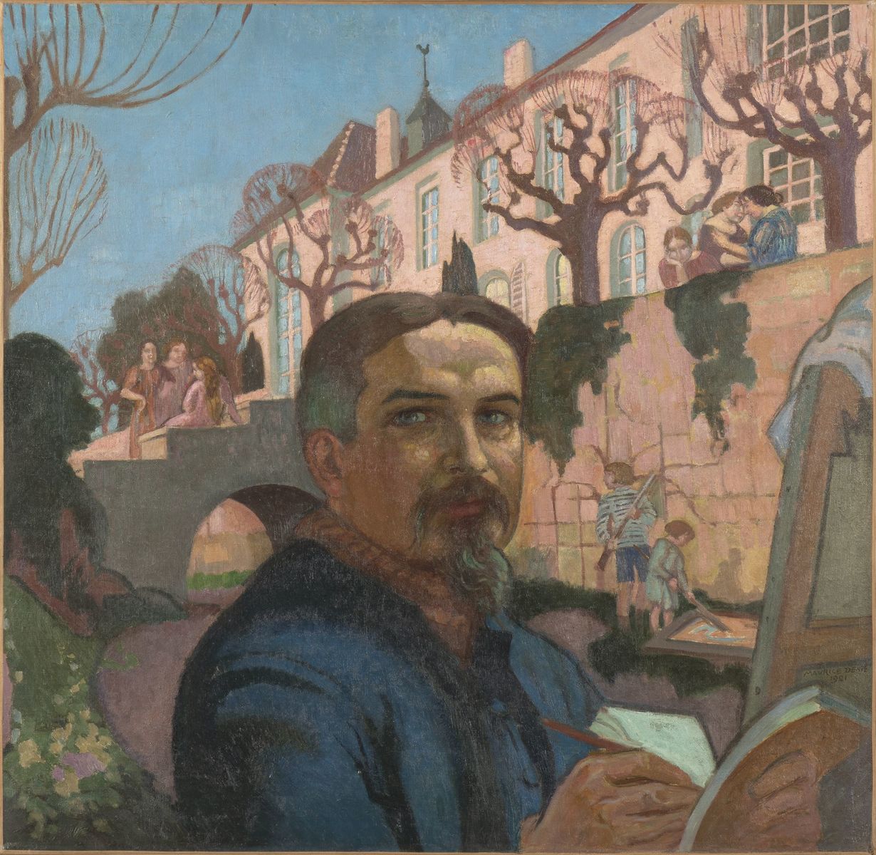 Après la mort de son épouse Marthe en 1919, Maurice Denis se retrouve seul avec de jeunes enfants et dans un grand désarroi matériel et moral. Cette toile où l’artiste s’est représenté peignant dans le jardin devant sa maison et entouré des siens raconte l’histoire de sa famille : ses deux garçons jouent, les filles bavardent et sur la terrasse, près de Noële pensive, Marthe, aussi réelle et présente que les autres, accueille Élisabeth, la future épouse, et lui ouvre les bras. Une première version de cet autoportrait devant le Prieuré, datée de 1916, est conservée à la Galerie des Offices à Florence.