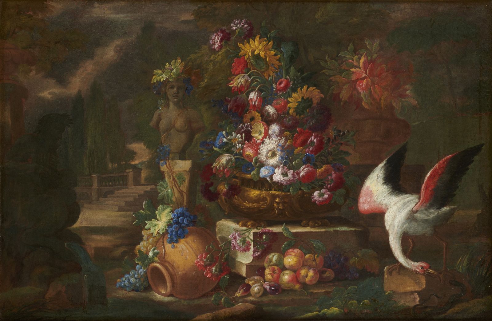 Vase avec des fleurs et des fruits. Une poterie est à terre. Un oiseau genre flamand aux ailes multicolores s'attaque à un reptile à droite. Au second plan, un buste de femme sur un piédestal.