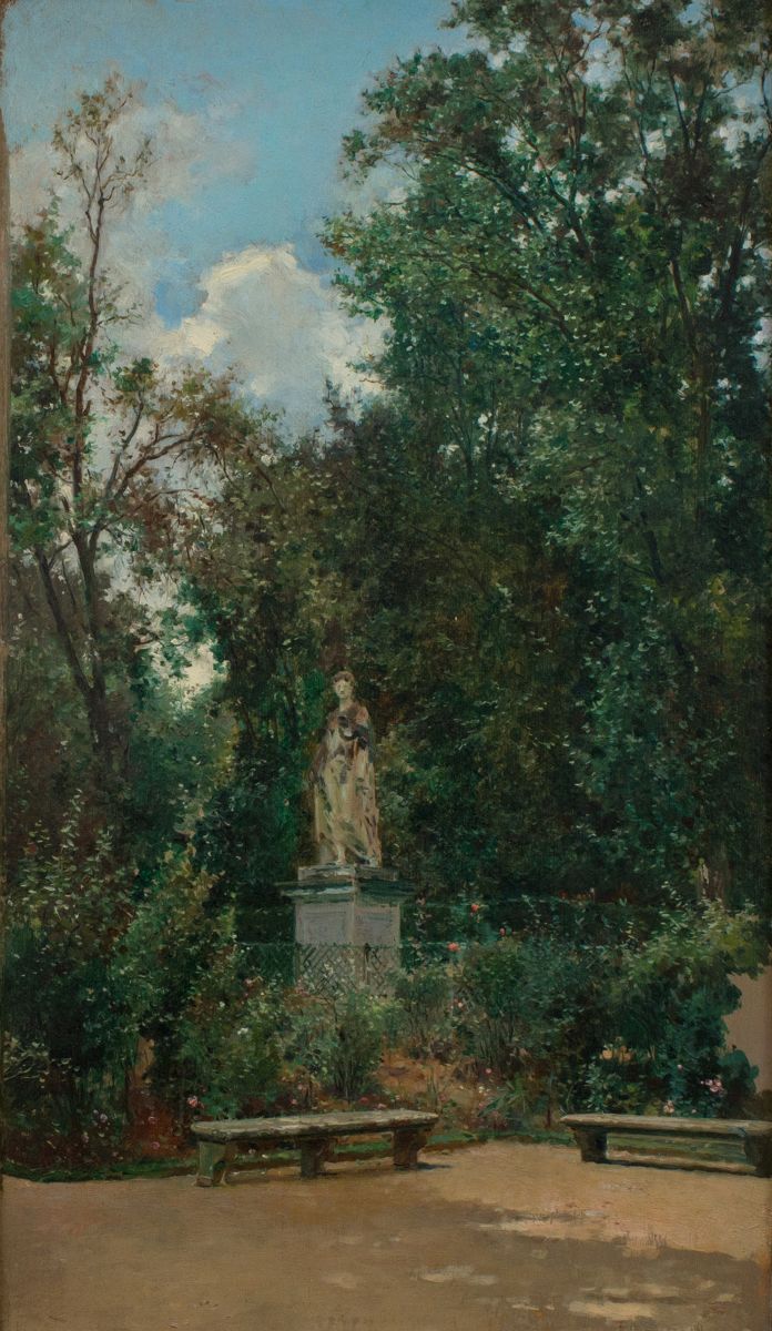 L'aspect mélancolique est donné par les deux bancs vides et par la statue, isolée au milieu des arbres. Ces deux petites peintures sont inhabituelles dans l’œuvre de cet artiste plus connu comme portraitiste mondain et témoignent de ses qualités de coloriste.