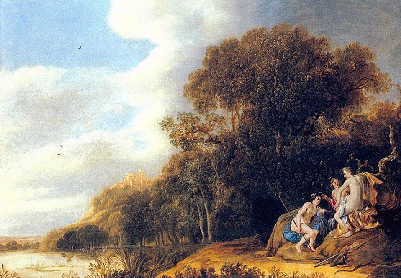 Dans un paysage calme et harmonieux, tout à fait caractéristique de la production de Keirincx, trois nymphes se reposent au bord d'un lac. L'ensemble est calme et apaisé dans une nature arcadienne. Paysage dans la tradition du paysage flamand. Dans l'angle inférieur droit, 3 nymphes nues se reposent apportant un complément idéal à cet élégant paysage.