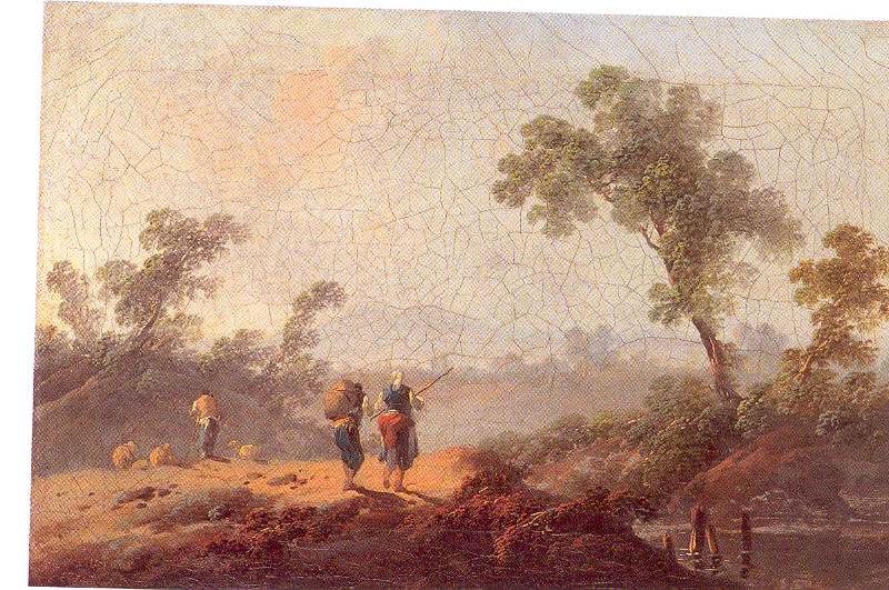 Dans un paysage bleuté, cheminent sur un chemin trois personnages vus de dos. Une femme aux robes courtes qui tient un bâton et un homme courbé sous un fardeau, sur le côté de cette sente un berger et ses brebis. Le lieu et les personnages sont indéfinis, seule compte la grâce et le caractère décoratif de la scène