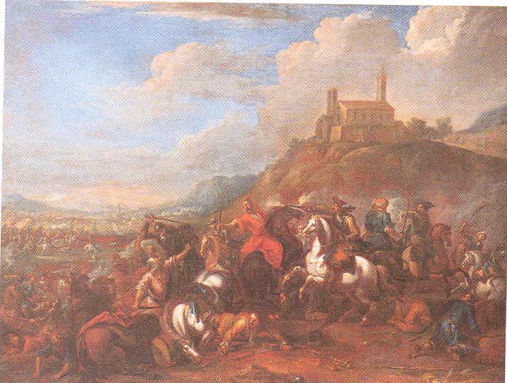 Au pied d'une colline où seule domine une église et son clocher, des cavaliers nettement identifiables par leurs tenues vestimentaires et leurs armes, se livrent un combat. Au centre de la scène, deux chevaux cabrés se font face : le cheval de gauche, de couleur noire, est monté par un cavalier turc qui brandit son sabre, tandis que celui de droite, de couleur blanche est monté par un cavalier chrétien, coiffé d'un chapeau présentant une plume sur le côté et braquant son arme. La partie gauche du tableau nous laisse entrevoir, à l'arrière plan, d'autres cavaliers au combat et, plus au loin, le clocher d'une église d'un village avoisinant.
