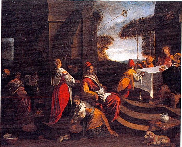 scène biblique (Pèlerins d'Emmaüs) ; scène (préparation des aliments, cuisine, volaille, assiette, vaisselle, cheminée) ; fond de paysage