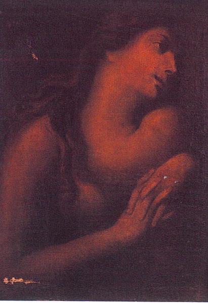 Etude de femme - pourrait être une Marie-Magdeleine - les cheveux dénoués glissant sur son épaule gauche présentée de profil gauche et les mains se croisant sur sa poitrine dénudée.