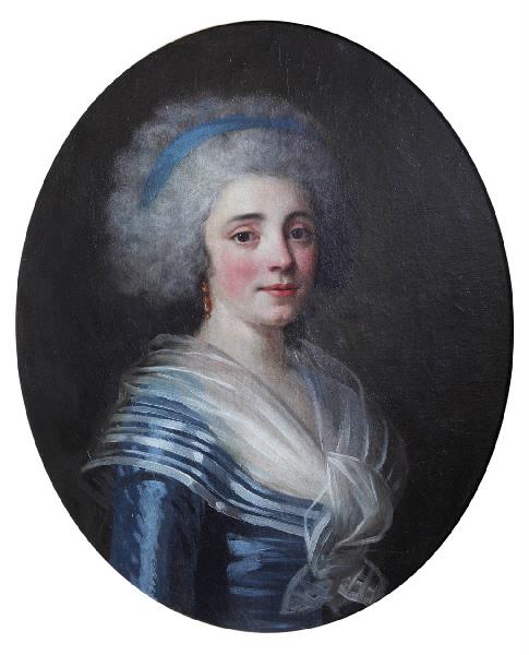 Portrait d'une jeune femme non identifiée. Présentée à mi-buste de trois-quarts face, elle porte une robe bleue et un modeste foulard de linon sur le décolleté. Le ruban dans ses cheveux poudrés s'assortit à la robe. Les carnations claires et rosées des joues et des lèvres répondent aux sourcils et aux yeux bruns inquiets. technique très lisse avec de légers empâtements pour les effets du châle.