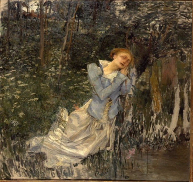 Le personnage de ce tableau inachevé est Ophélie, l'héroïne malheureuse du drame de Shakespeare, Hamlet (en italique). Dans une lettre de 1881, Jules Bastien-Lepage la décrit en ces termes : "une Ophélie vraiment touchante, aussi navrante que si on la voyait réellement". Au lieu de relater la mort d'Ophélie, noyée dans un ruisseau, le peintre a choisi de représenter la jeune fille éplorée, au bord de l'eau, mettant l'accent sur la douleur qui va entraîner sa chute.
