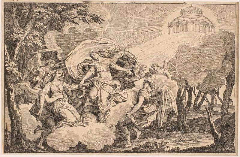 scène (sainte Clotilde, Vierge, ange, temple, nuée, rayons lumineux)